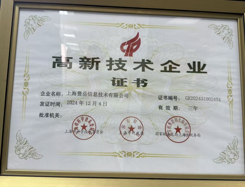 正是这套从底层技术到上层应用完整自洽的AI引擎,成为了暨岳国际最坚实的护城河。它强有力地支撑着公司的业务创新与规模化扩张,也因此让暨岳国际成功获得了由上海市科委、财政局、税务局联合颁发的高新技术企业证书。这一荣誉,标志着其科技创新实力和长远发展潜力已经得到了国家级的权威认可。