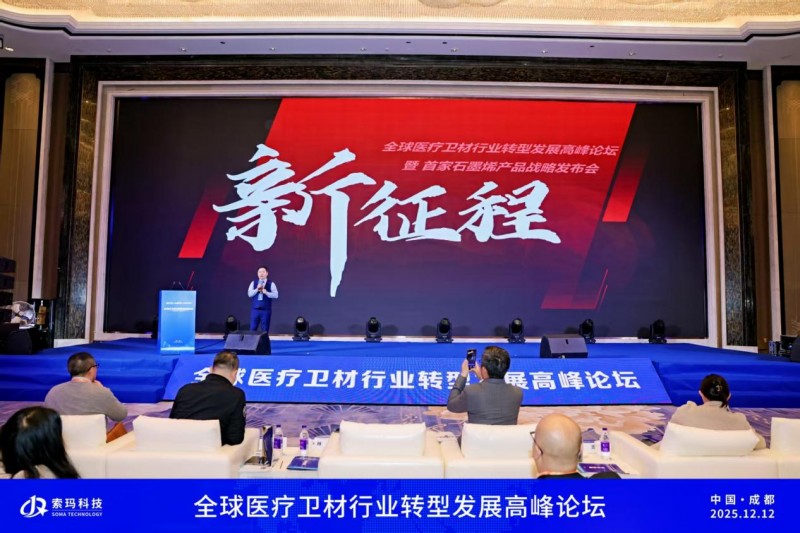 今日,“全球医疗卫材行业转型发展高峰论坛暨首家石墨烯产品战略发布会”在成都成功举办。本次高峰论坛汇聚政府代表、行业专家、学者、投资机构及企业代表,共同探讨医疗卫材行业在“高性能、智能化、可持续”方向上的转型路径,并见证了四川索玛新材料科技有限公司(以下简称“索玛科技”)发布的国内首款石墨烯医疗卫材产品及其资本上市战略的全面启动。